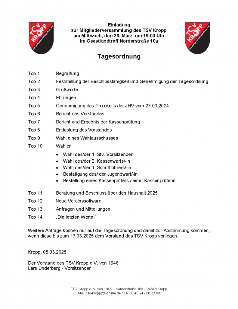 Einladung zur Mitgliederversammlung des TSV Kropp